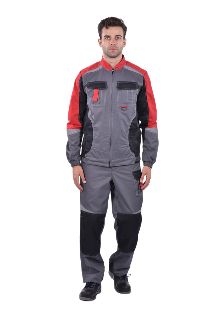 ➠ Куртка: цвет серый с красной и черной отделкой, силуэт прямой, пояс притачной, застежка на молнию, воротник стойка. Накладные карманы комбинированные с малыми накладными карманами с разделителями. Прорезные карманы на нижней части полочки. По шву притачивания кокетки вверху и по рукавам фигурные вставки СОП.