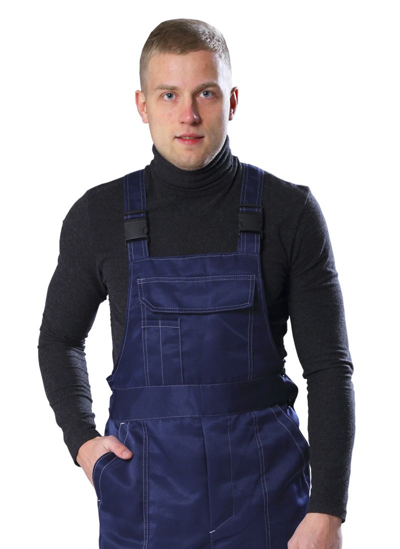 Полукомбинезон с втачной в пояс грудкой и спинкой, застежка гульфика на пуговицы, с левого бока шва имеется застежка на пуговицы. Передние половинки с двумя боковыми накладными карманами.