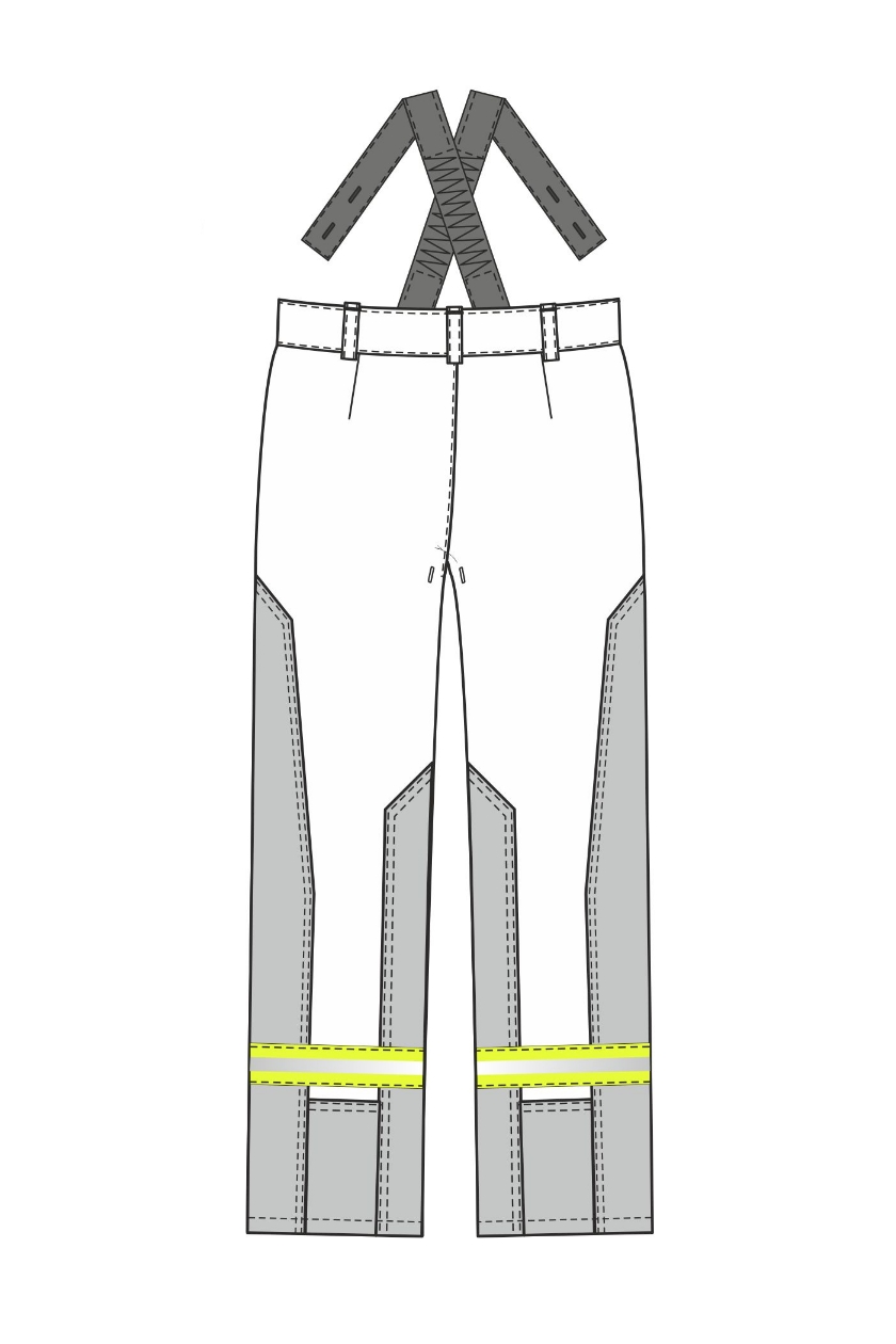 ➠ Брюки с притачным поясом, застежка гульфика на пуговицы. На правой передней половинке – накладной карман с клапаном. Передние половинки с усилительными накладками от линии бедра до низа с заходом на боковые швы. Брюки с бретелями. Нитки и фурнитура огнестойкие. По низу брюк расположен СОП 50 мм, огнестойкий.